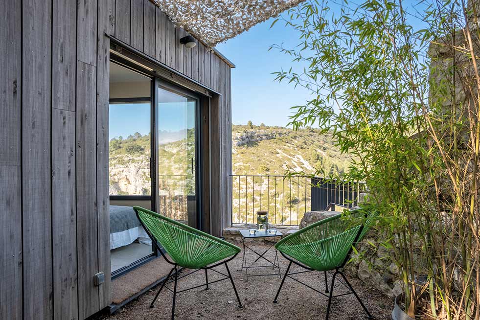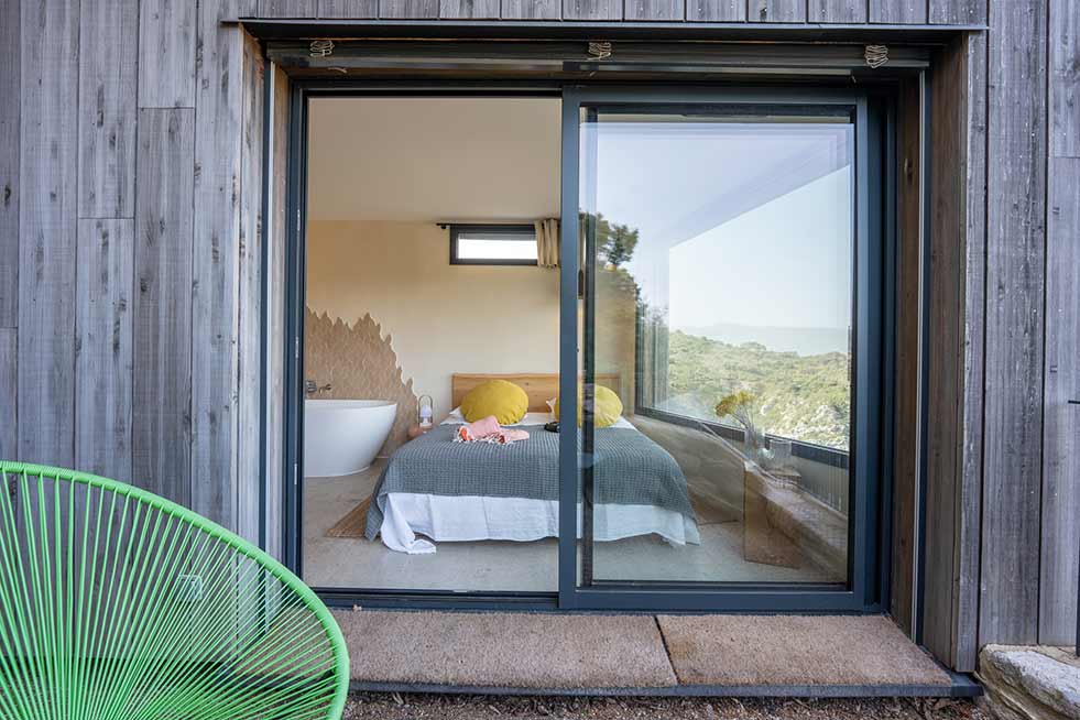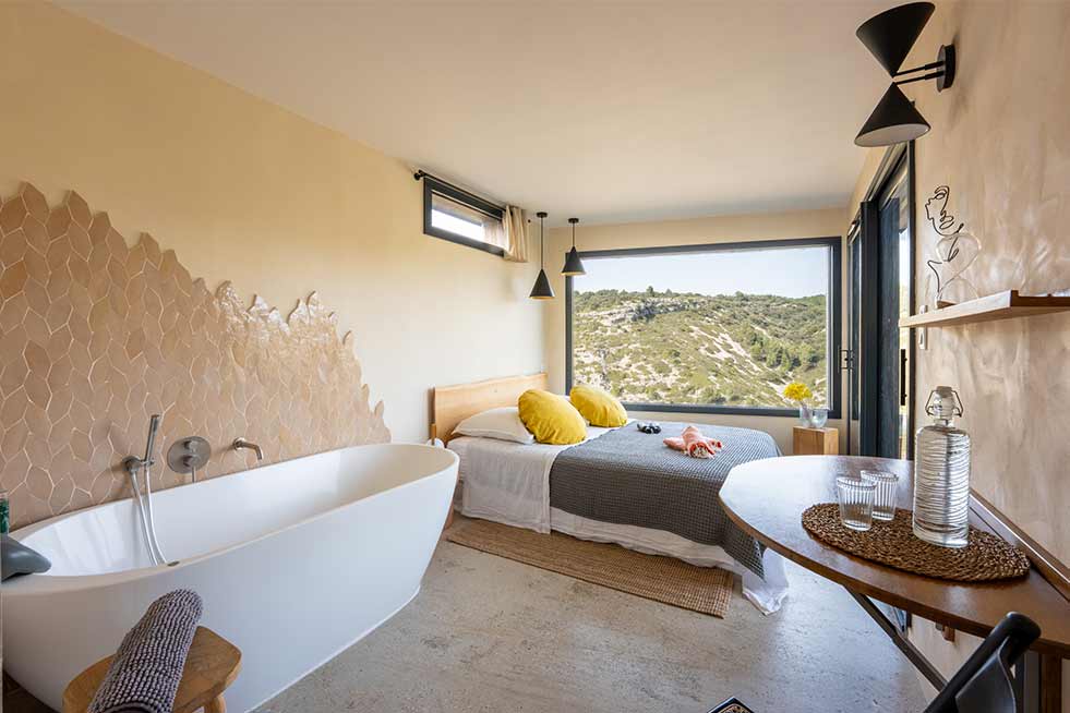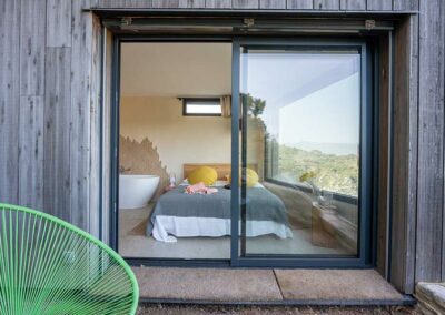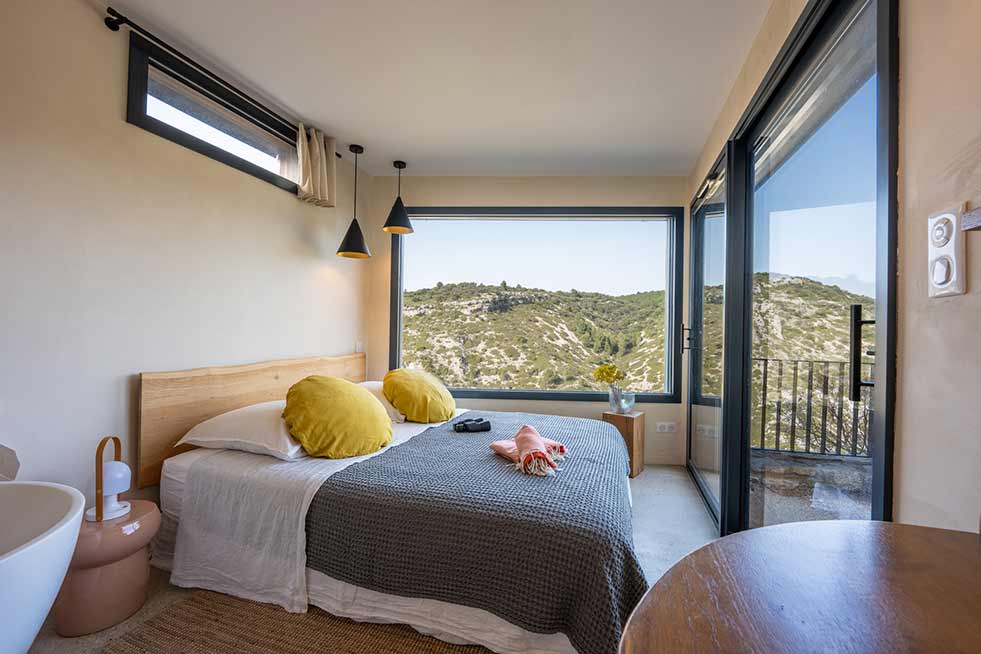 Intimiste et déconnectée de la maison, elle vous offre une vue à couper le souffle depuis le lit et la baignoire balnéo. Son emplacement, ses grandes baies vitrées XXL, ses stores, sa conception 100% bois et son aménagement simple et épuré, vous combleront.