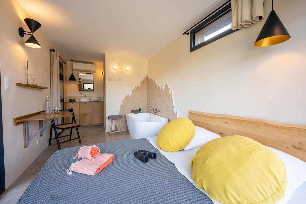 Tout de bois made in France, située au bout du jardin, sous un grand pin, face à un paysage grandiose, ici pas de télévision… mais une paire de jumelles pour se reconnecter avec la nature environnante. Un espace extérieur vous est réservé avec table et transats. Pour vous sentir totalement en vacances, le petit-déjeuner est inclus, il vous sera servi dans la grande salle commune. Un service quotidien de ménage est prévu (à l’exception du dimanche).