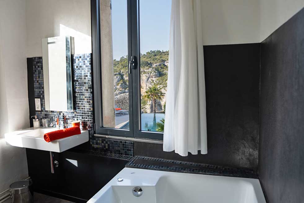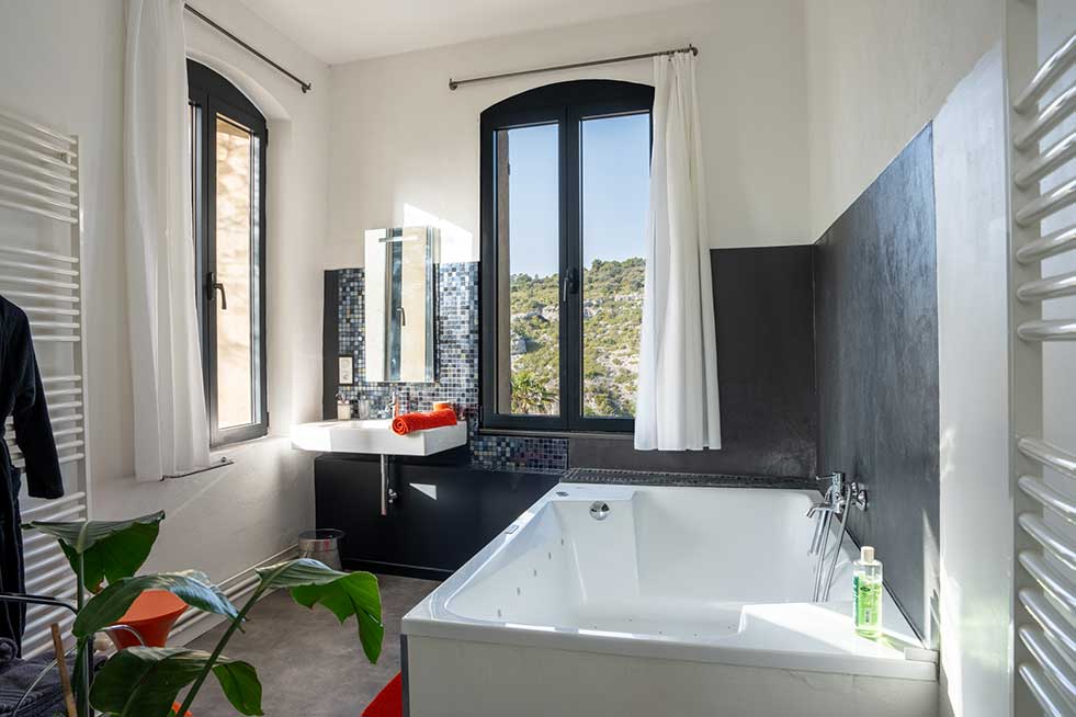 La chambre à coucher s’ouvre sur une vue spectaculaire de la vallée, du village, des gorges et du Mont-Ventoux.