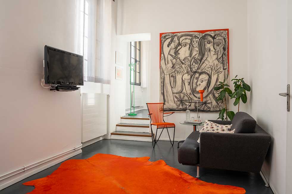 Elle offre un espace salon au design contemporain, sofa Cassina et coin bureau, jolie table basse chinée aux puces de l’Isle-sur-la-Sorgue.